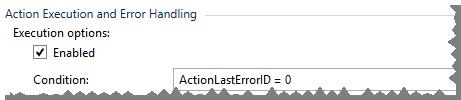 Each action can be set as a conditional action. Conditional action only runs if the provided condition allows it to be run. Condition is a single line script (VBScript or Python). To define the condition, click the Show execution and error handling options in action properties to expand the possibilities.