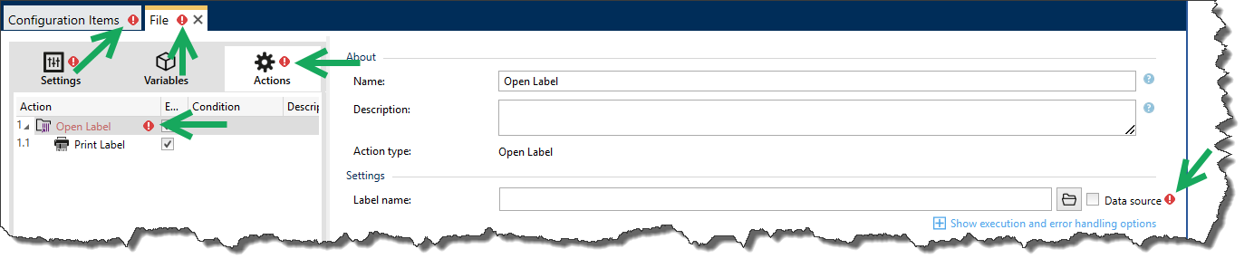 In this case, the Open Label action reports configuration error. There is no parameter specified for the label name. The red exclamation icon pops up next to the erroneous parameter in the action itself, in the action list, in the Actions tab, in the trigger tab, and in the Configuration Items tab. This makes the issue easy to identify.