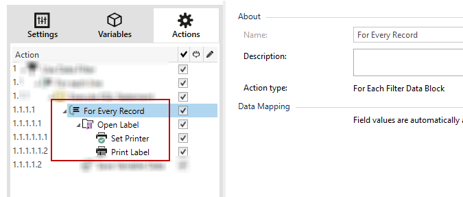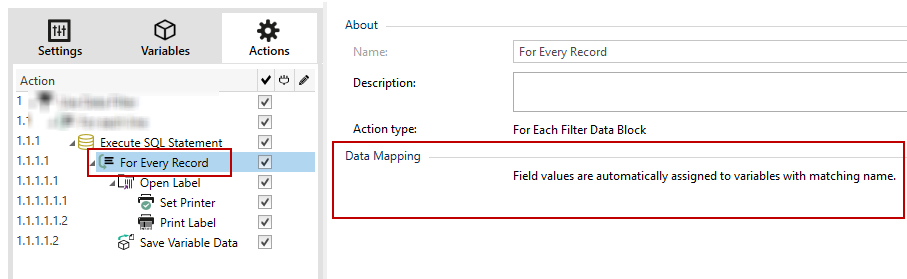 If you use the action Execute SQL Statement with enabled option Iterate for Every Record, Loftware automatically inserts For every Record action. A note appears about the automatic mapping of your variables.