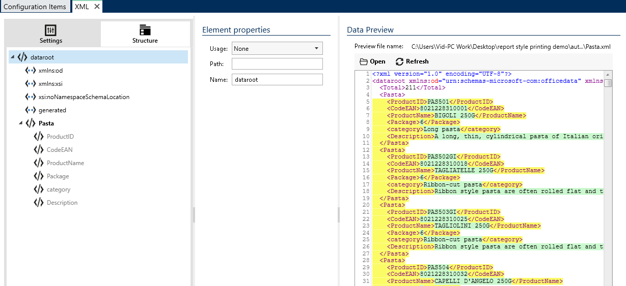 Create a temporary database with data from your business system (Usually XML or JSON data). With your temporary database, design and configure your reports. Your temporary database is only for setup. Configured reports print using Automation triggers, not your temporary database.