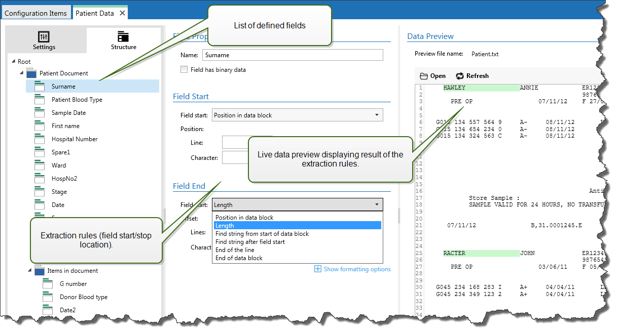 Position in document: Hard-coded position in the data determines the start/end point. The coordinate origin is upper left corner. The character in the defined position is included in the extracted data.