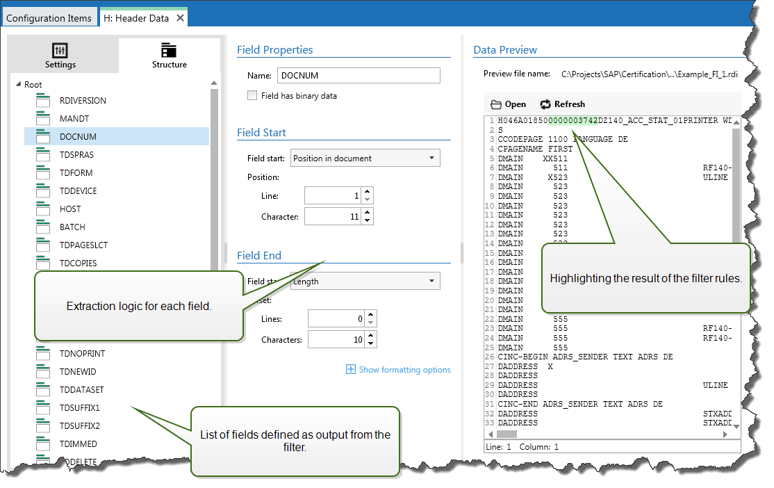 Field: Specifies the location of field data between field-start and field-end locations. There are various options to define the field location, from hard-coding the position to enabling relative placements. You must map the defined fields to respective variables in the Use Data Filter action. For more information, see section Defining Fields.