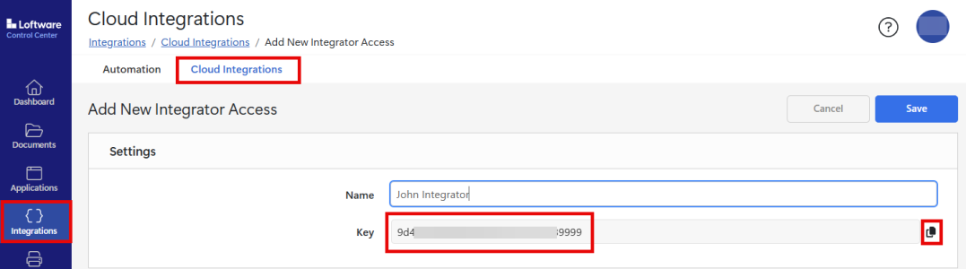 The Loftware Cloud administrator gives the external integrator access to the cloud trigger in Control Center. When done, the Loftware Cloud administrator sends the external integrator the corresponding integrator key.