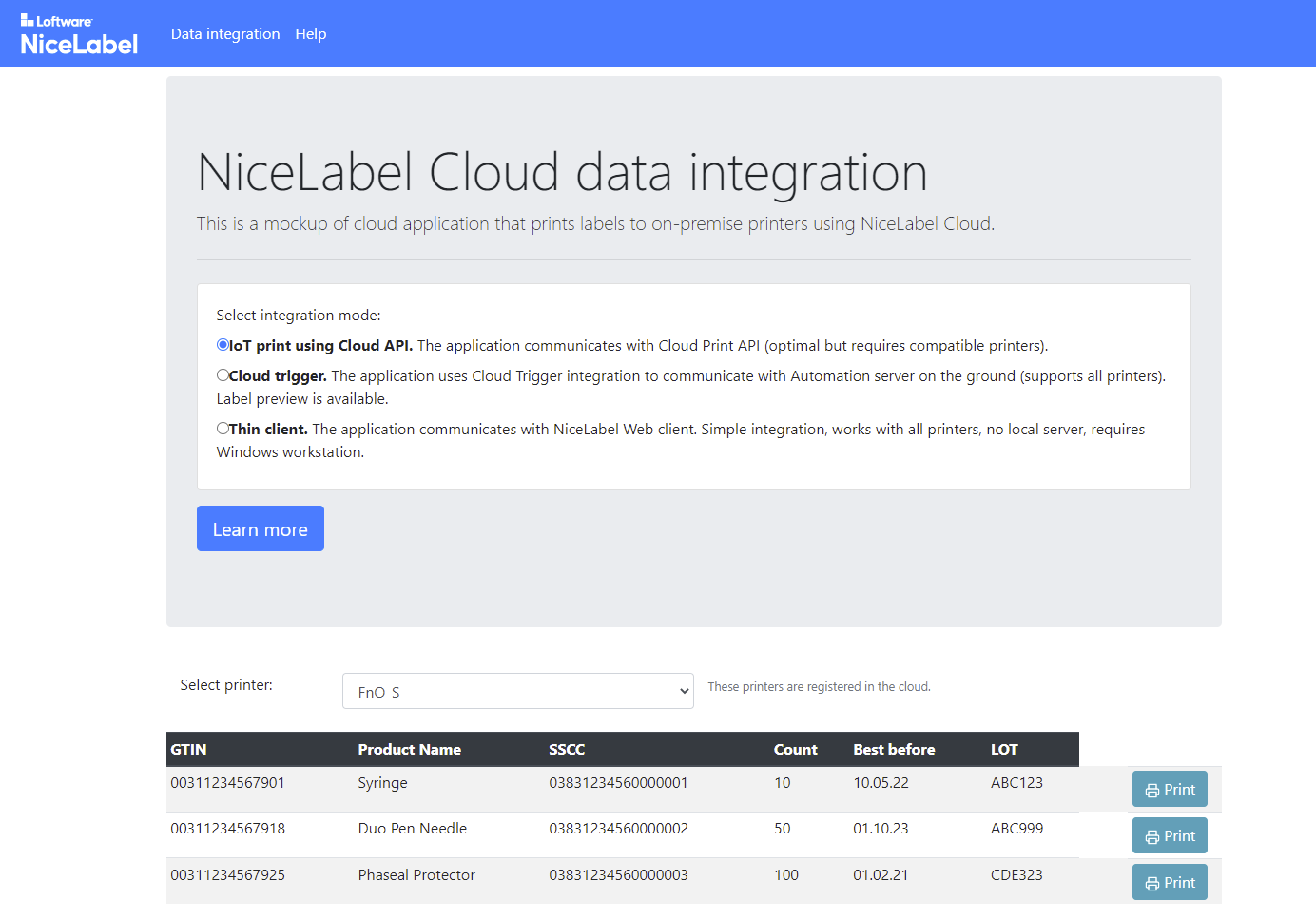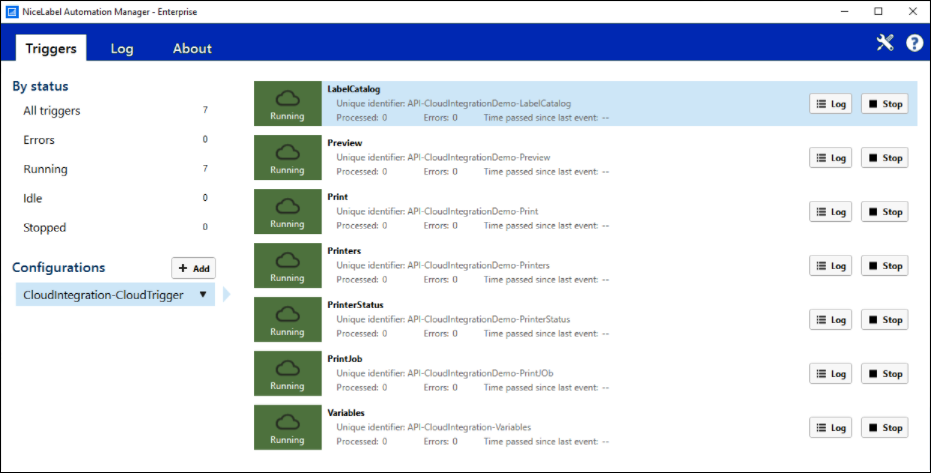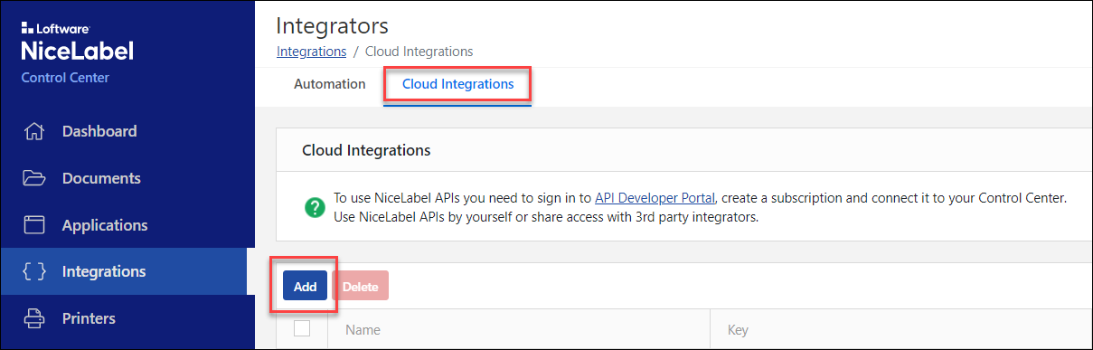 Cloud Integrations you create in Control Center authenticate your Cloud Print APIs and Cloud Trigger APIs. You use the same Cloud Integrations for IoT print using Cloud API and Cloud trigger printing demos.