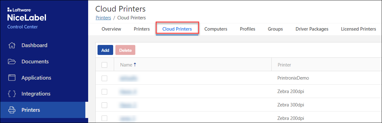 Your list dynamically displays printers registered to your Loftware Cloud account. If your list is empty, register your printers. See Registering cloud printers.