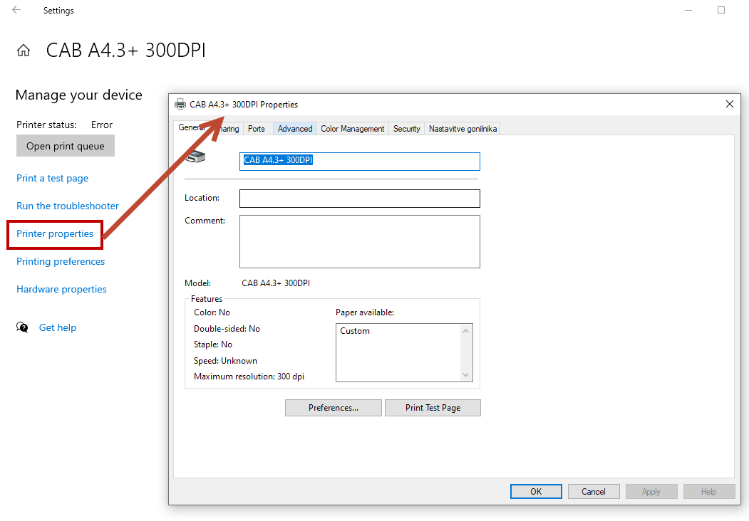 Printer properties to open a window with all printer settings.