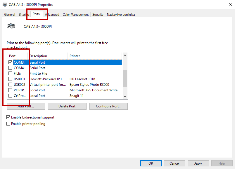Ports tab and check if the correct port is selected.