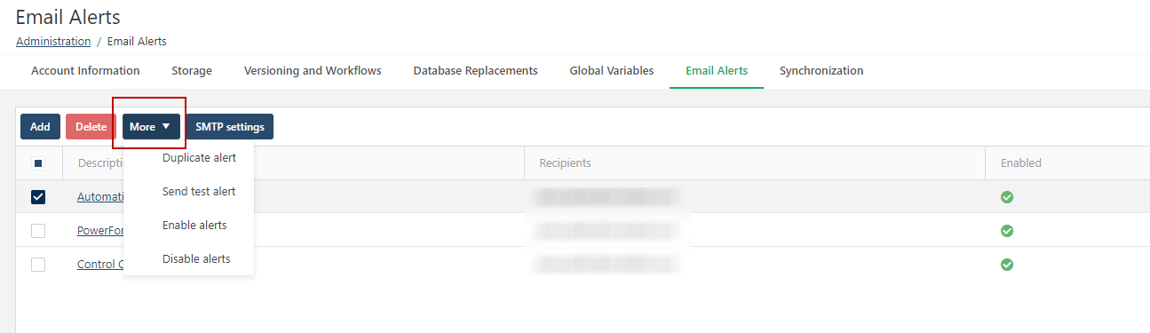 Duplicate alert . If you want to create a similar alert to the existing one, you can duplicate the existing one and modify it. Modify your duplicated alert by clicking on it.Send test alert . You can send a test alert directly by clicking this option. You don't have to open the alert settings window to send the alert.Enable alerts orDisable alerts . While creating your alerts you might disable them. You can change the Enable or Disable statuses directly by clicking the options. You don't have to open the alert settings window to change the statuses.