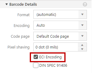 To enable ECI Encoding, go to Barcode Properties > Barcode > Details.