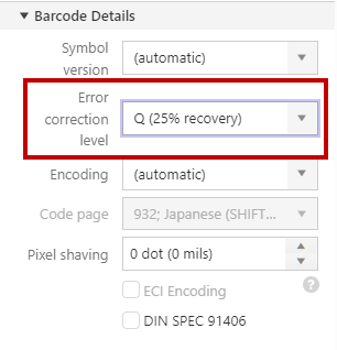 Error correction level defines the percentage of the total 2D barcode allowed to be dirty or damaged without being able to read. Level L can be dirty/damaged for up to 7%, level M 15%, level Q 25%, and level H 30%.