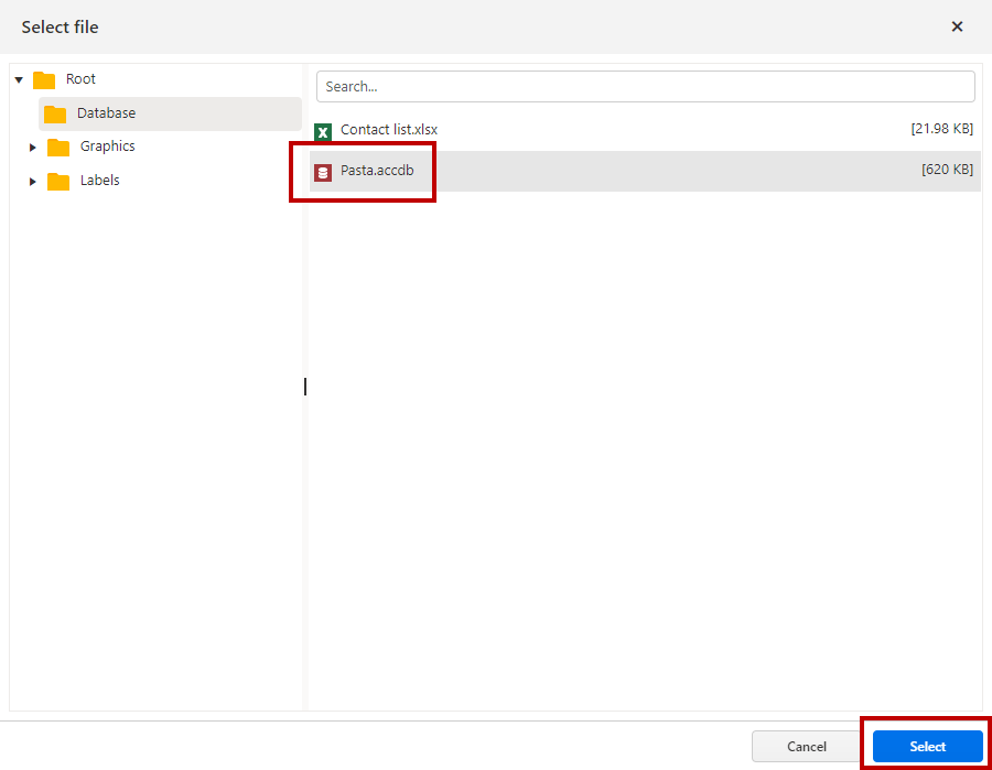 Add database drop-down menu, then clickFrom Documents .Navigate to the location where your database is stored, click your database, then click