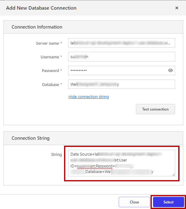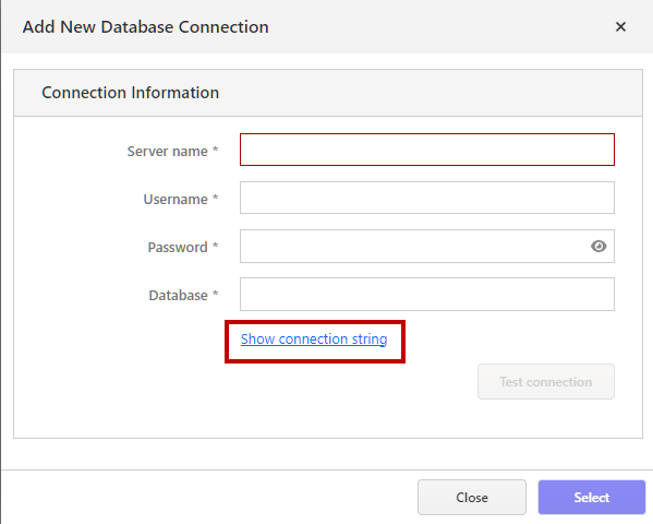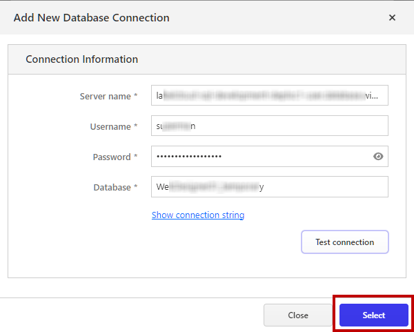 Add New Database Connection window opens. Insert your SQL Server and database details, then clickSelect .