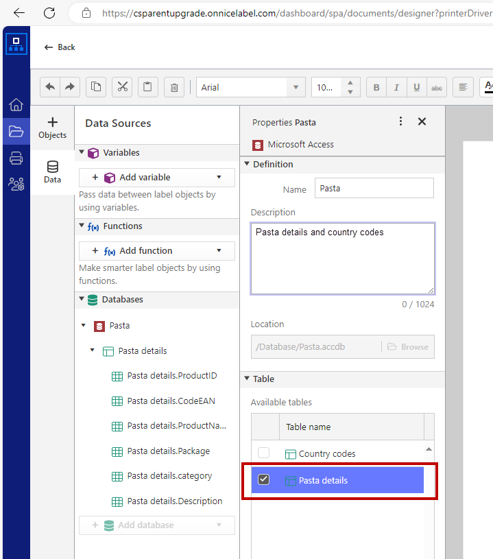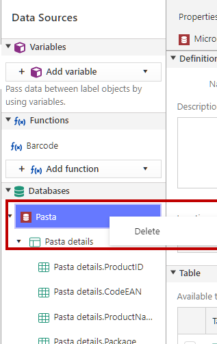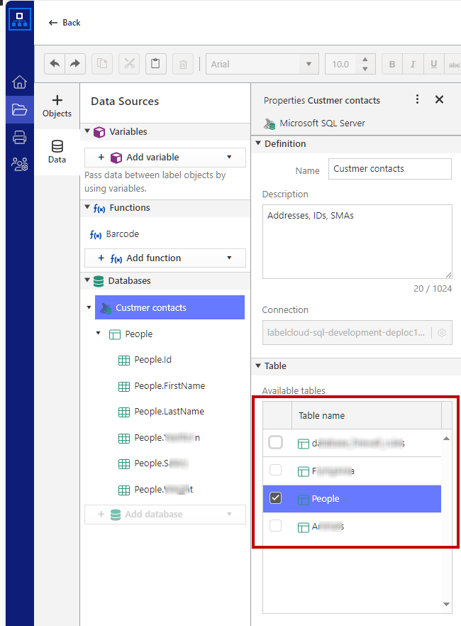 Properties window opens on the left side of your label design. You can change the name of your database connection, add your description, and select the table.