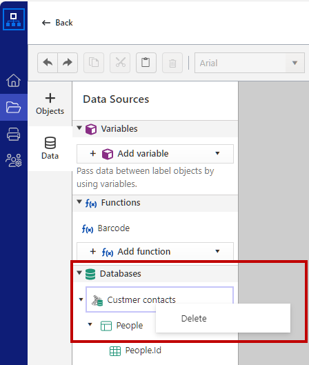 To delete the database connection, first delete all label objects connected to your database. Then right-click your database and select