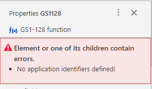 At the opening of the Properties window, an error message occurs automatically because barcode has a default content that is not correct for GS1-128 function. GS1-128 function must contain at least one application identifier (AI).