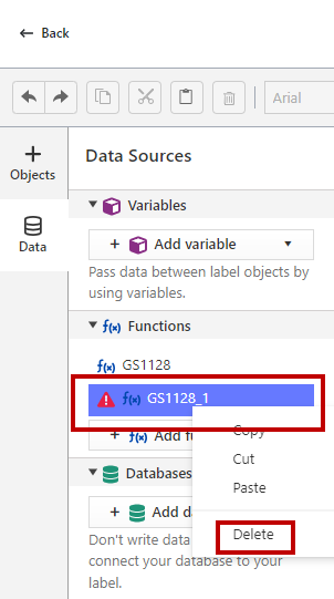 GS1-128 barcode orGS1-QR Code , a new GS1-128 function is automatically created. If you want to use your existing GS1-128 function, select the function in theData Source >Type drop-down menu.