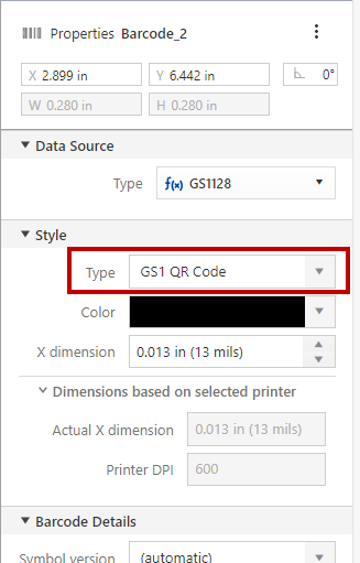 Style section, selectGS1-128 barcode orGS1 QR Code .
