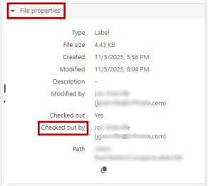 You can see the user who has the label checked out in the Documents section. Click the label file and review the File Properties on the right side of your screen.