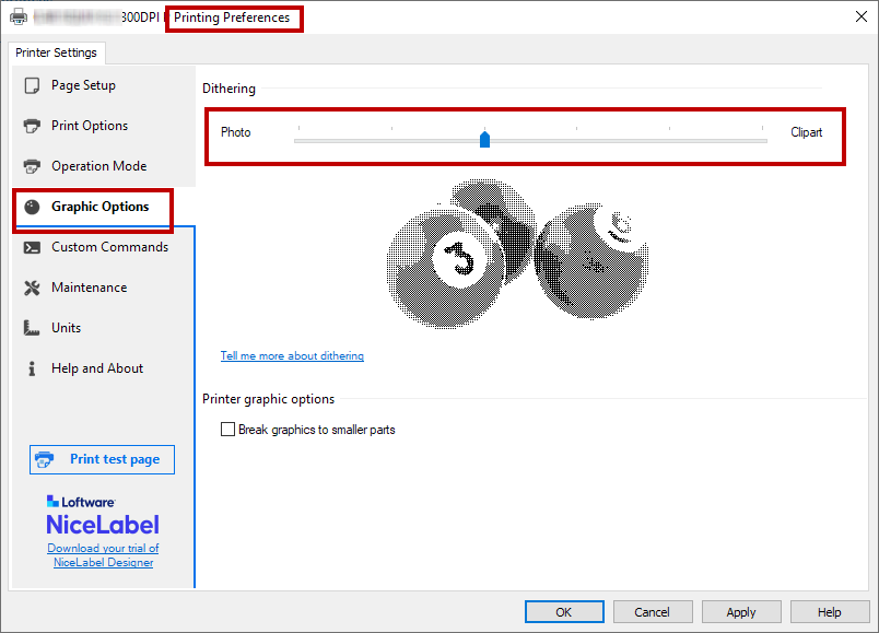 Graphic Options (Dithering values) in your Loftware driver settings >Printer Settings .- On the computer where Loftware driver is installed, open Windows