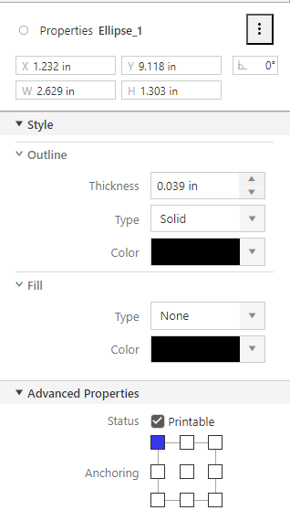Fill :Type : You can fill your ellipse with different saturation levels of the selected color. If you select values other thanNone , the content within the ellipse (images, barcodes, texts) will not be visible anymore.Color : You can select your fill color if your printer enables color printing.Note
