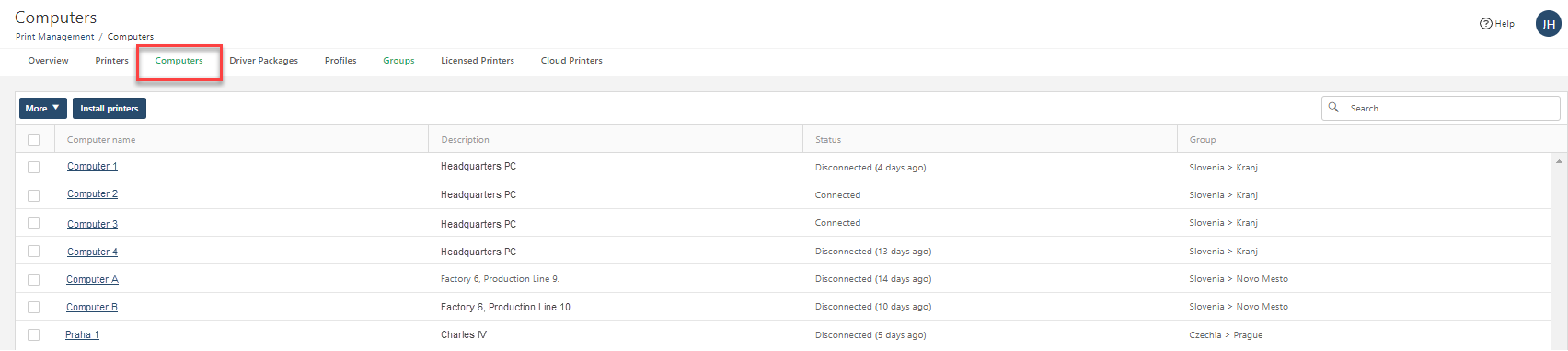 Groups to make sure your printer operators with access to specific groups have permissions to install and update printers on computers they need. To add computers to groups, select your computers and clickMore >Set group . For more information, read Groups