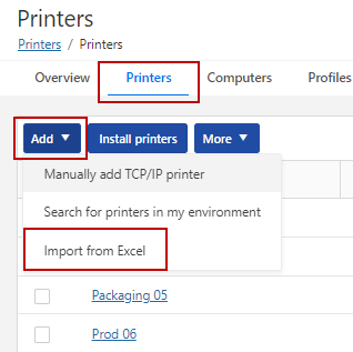 You can also use the Excel table if you don't have user rights to install printers in Control Center. You can send the Excel file to the Control Center administrator who can import the Excel file and install printers.