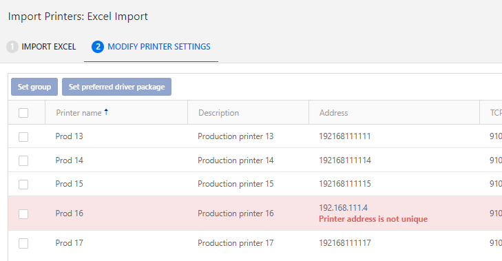 Printers-import.xlsxcompares the data in thePrinterssheet (blue columns) to data in other sheets. If data don't match, thePackage checkcolumn shows an error.You can't insert driver packages data that is not stored in Control Center.