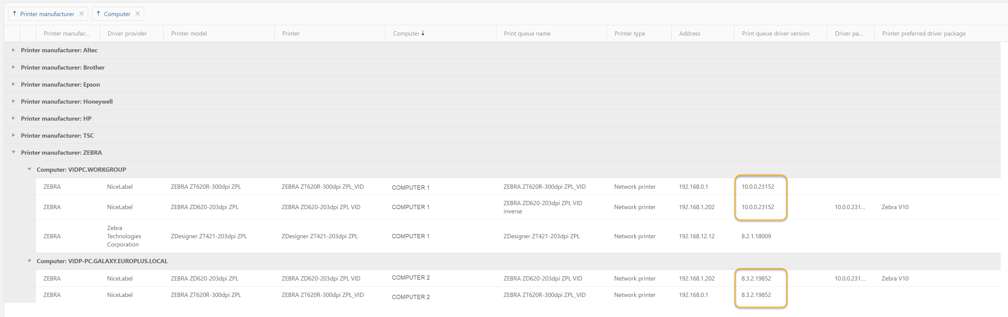 Printer manufacturer andComputer name column headers to group by those columns.
