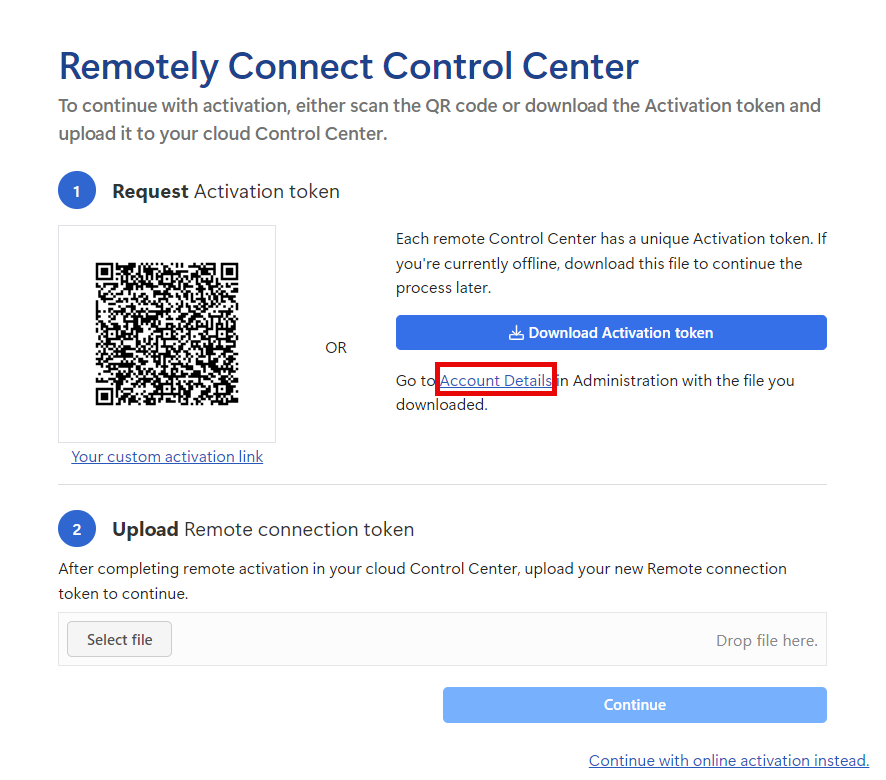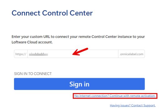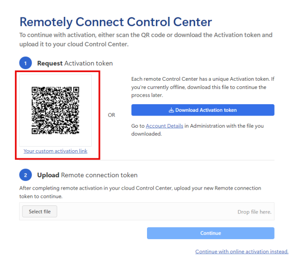 Go to your remote Control Center. Enter your Control Center domain, and click No internet connection? Continue with remote activation..