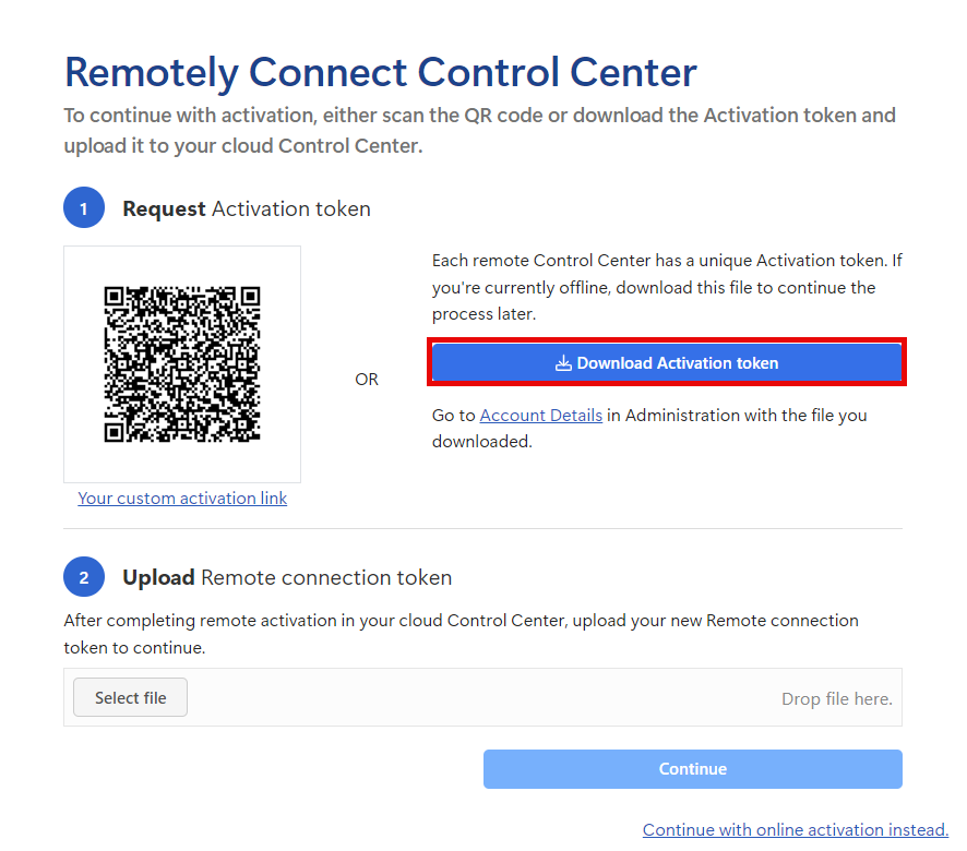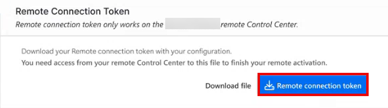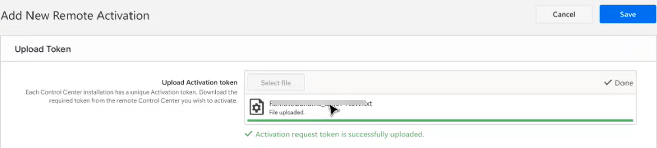 Tip: Remote connection token is not the same as activation token. User gets the remote connection token from the cloud Control Center and uploads it to remote Control Center to finish the remote activation. -