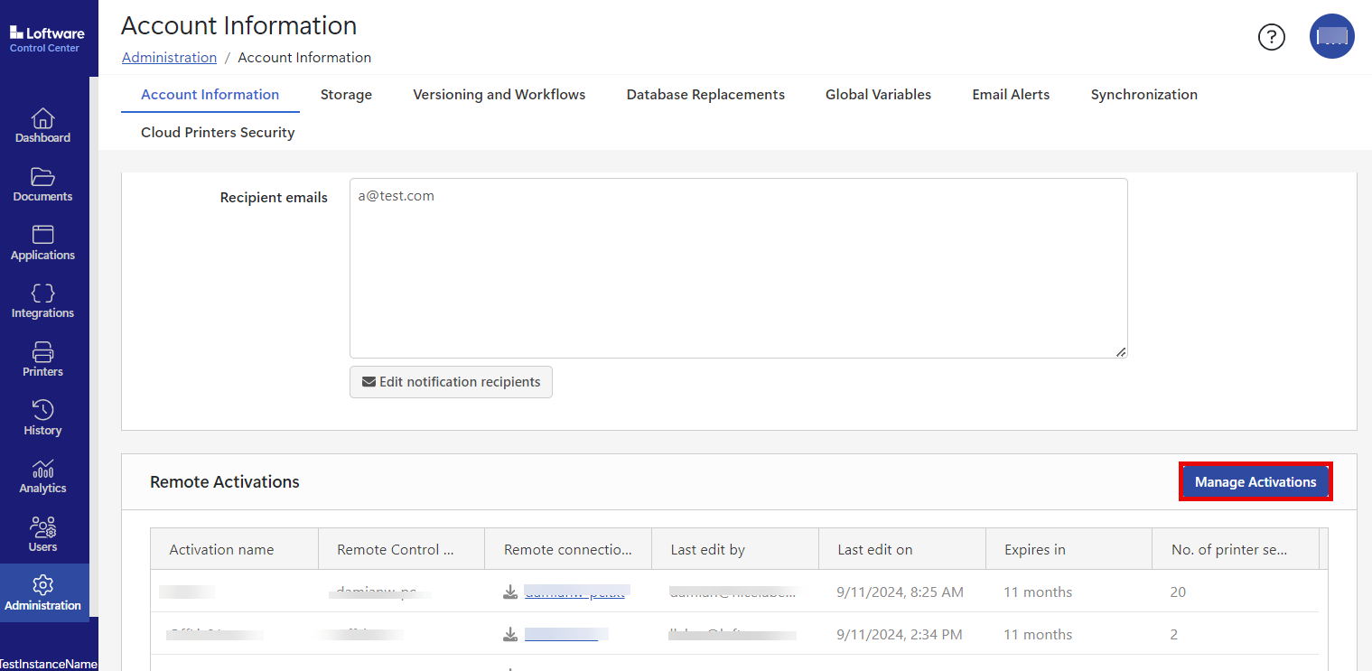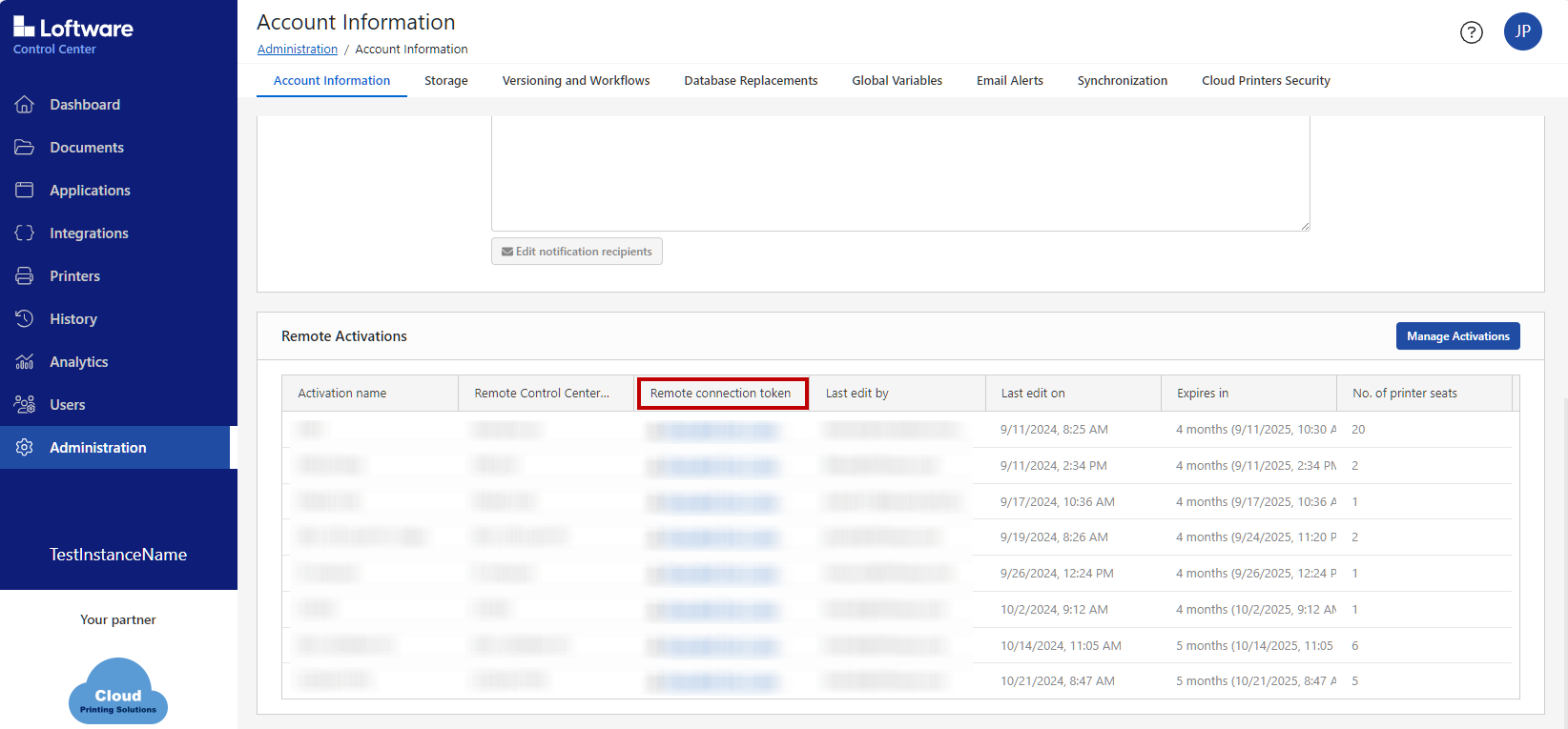 Remote activation is only available in the hybrid deployment of Control Center. Hybrid deployment is a payable add-on to your Loftware Cloud. For more information, contact Loftware.