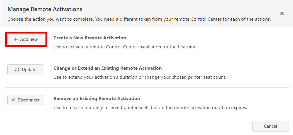 The Manage Remote Activation window opens. To create a new remote activation, click Add new.
