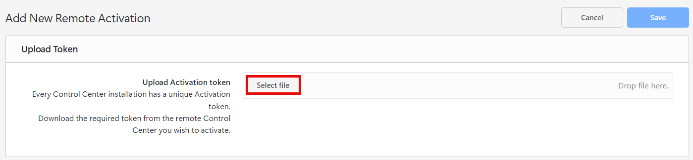 Tip: The Activation token is used for user authentication and software activation. The user gets it from the remote Control Center and uploads it to cloud Control Center.