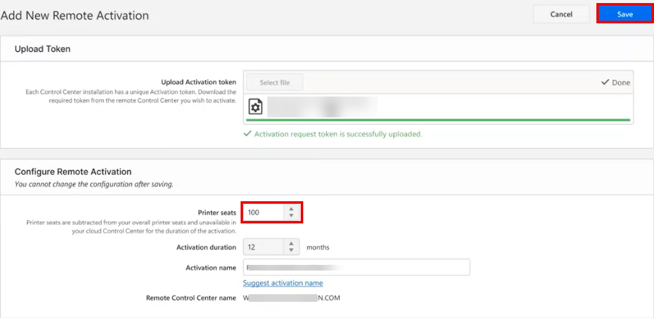 Important! After you click Save, you can't edit the configuration. To change your configuration after you click save, you have to update your remote activation. For more information, see Updating or changing remote activation.