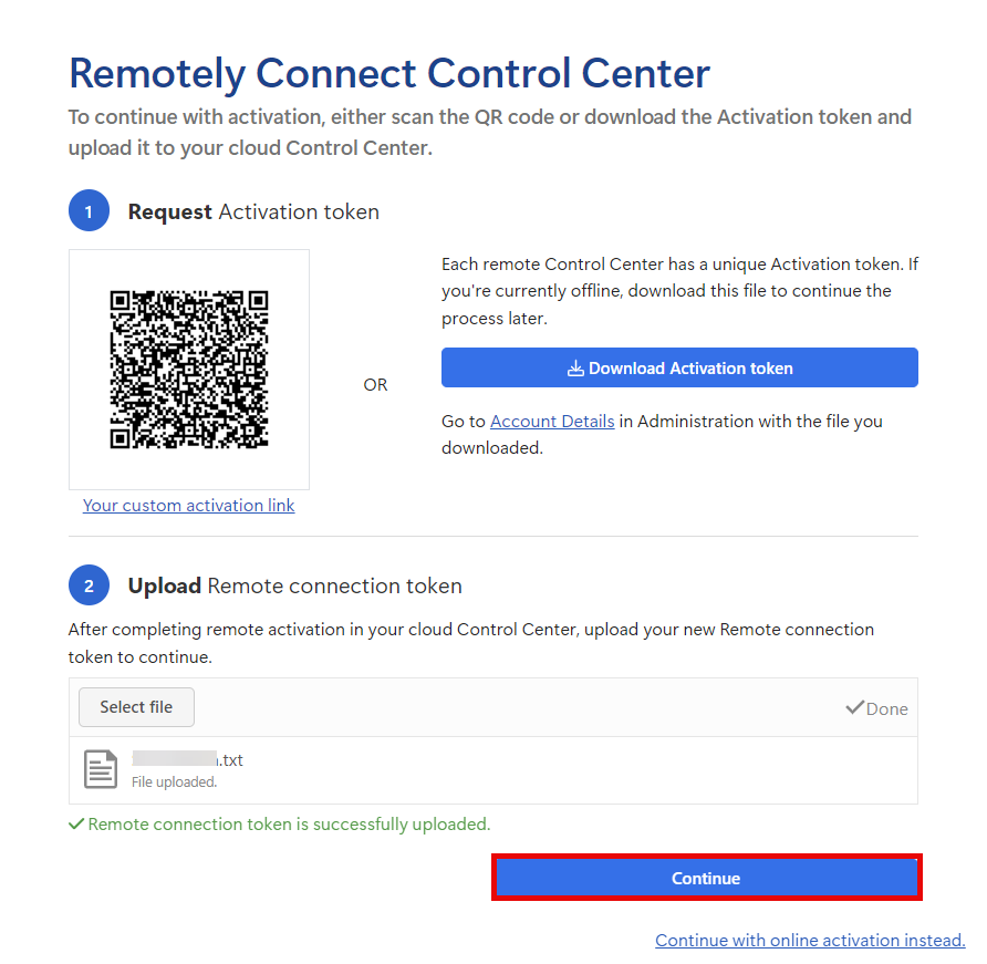 Go back to the Remotely Connect Control Center window on your workstation (see step 1 in Remotely connect your Control Center). Upload your Remote connection token. After you successfully upload your remote connection token, click Continue.