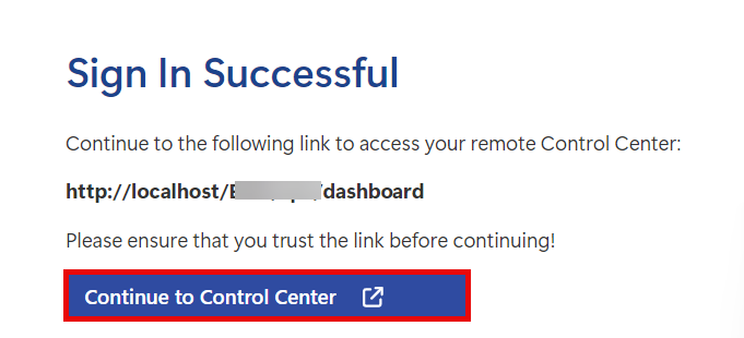 You successfully completed your remote activation. You can now follow the link to your remote Control Center and start working offline.