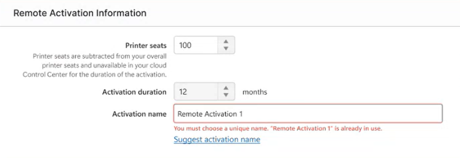 - Activation name – Give your activation a unique name or click Suggest activation name. You can't choose an activation name that is already in use.
