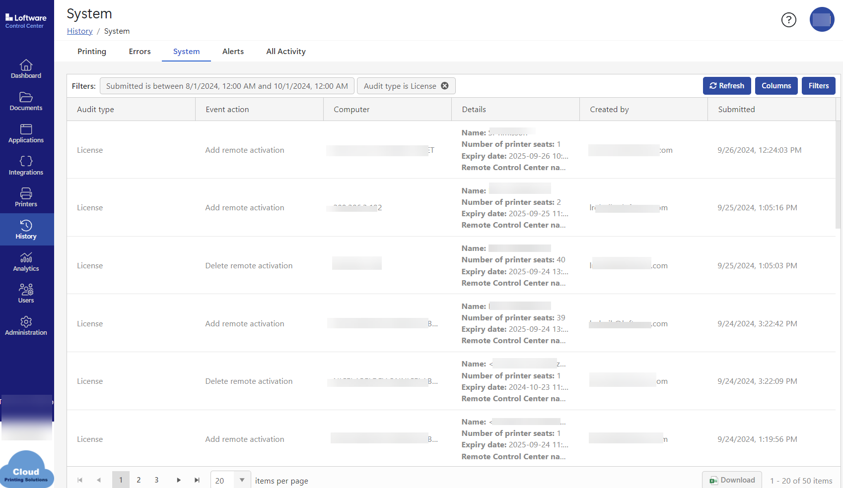 You can see remote activations in cloud Control Center > History > System. Go to Filters > Audit type, and select License.
