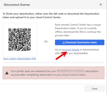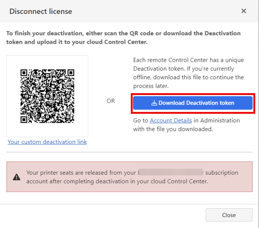 Tip: The Deactivation token is used for deactivating the user's remote activation. The user gets it from the remote Control Center and uploads it to cloud Control Center.Warning! Without the Deactivation token the printer seats stay reserved until the remote activation expires. -