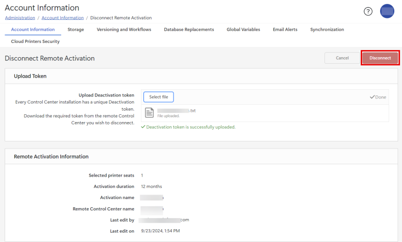 The Disconnect Remote Activation window opens. Upload your Deactivation token. After the Deactivation token is successfully uploaded, the Remote Activation Information section uploads on your screen.