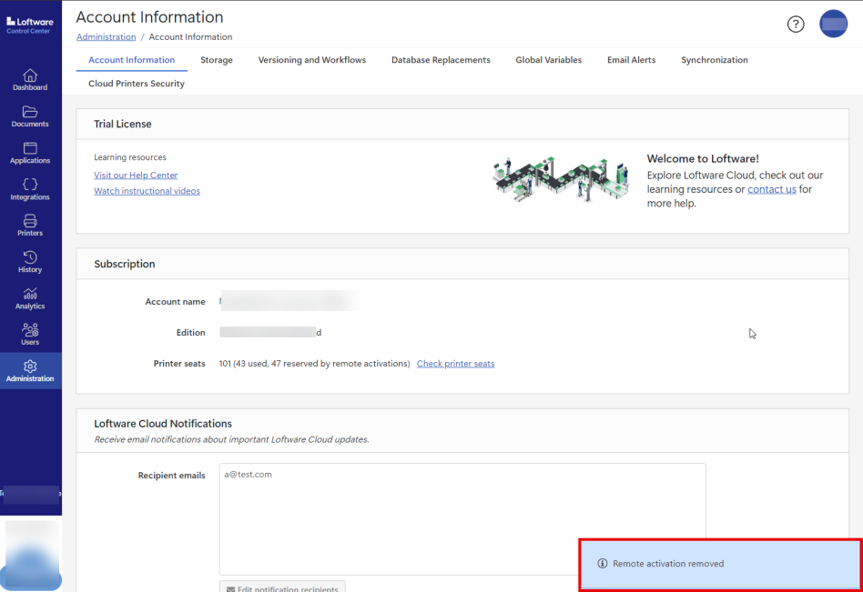 Remote activation is only available in the hybrid deployment of Control Center. Hybrid deployment is a payable add-on to your Loftware Cloud. For more information, contact Loftware.