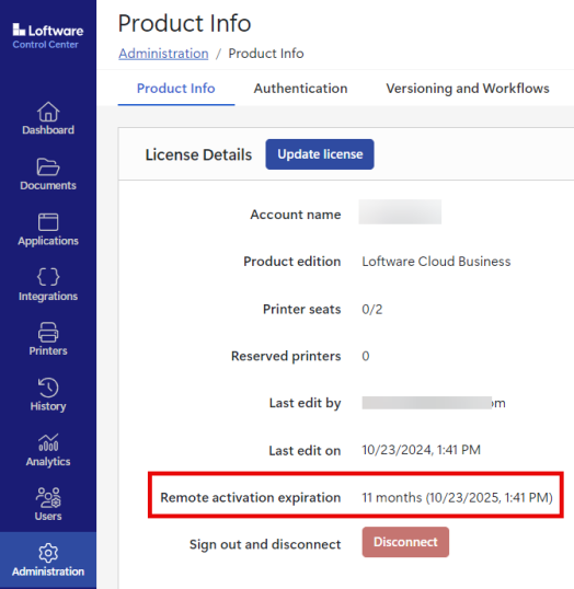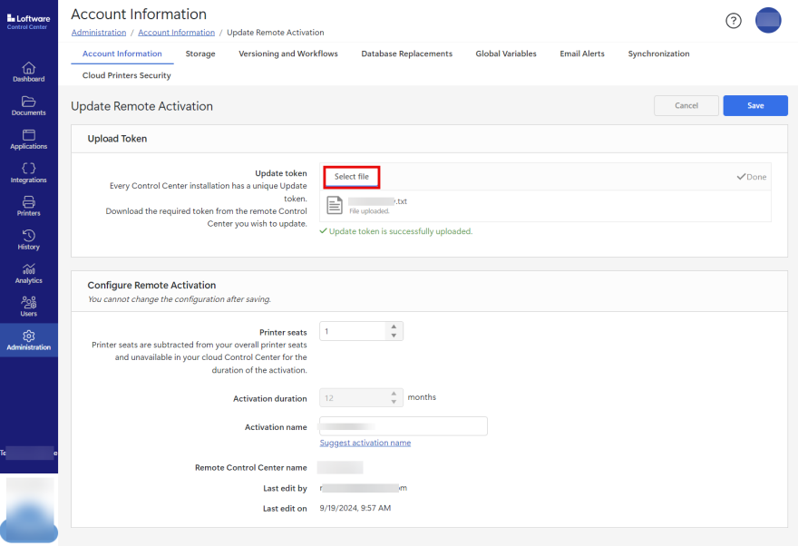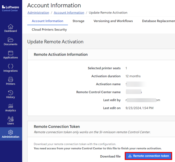 Remote activation is only available in the hybrid deployment of Control Center. Hybrid deployment is a payable add-on to your Loftware Cloud. For more information, contact Loftware.