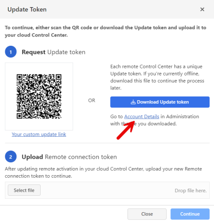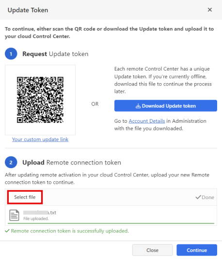 Tip: The Remote connection token is not the same as Update token (see step 2). User gets the remote connection token from the cloud Control Center and uploads it to remote Control Center to finish updating the remote activation. -