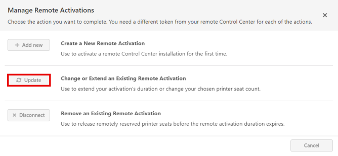 If you configured more printer seats to your remote Control Center than you need when you created your remote activation, you can update your remote activation. When you update your remote activation, you can give more or less printer seats to your cloud Control Center. See more about counting printer seats for printer seat-based licensing.