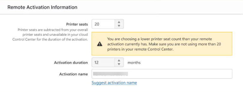 Important! After you click Save, you can't edit the configuration. To change your configuration after you click save, you have to update your remote activation. For more information, see Updating or changing remote activation.Important! If you update to reconfigure to less printer seats than before, you get a warning. Make sure you are not going over the number of printer seats you have on your license. Read more in Using too many printers.