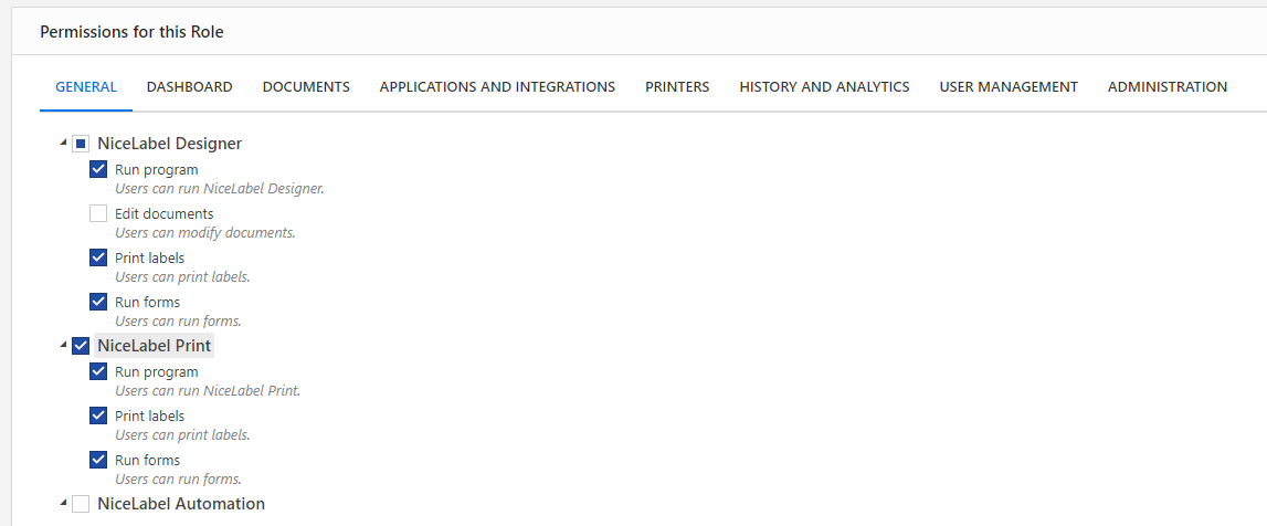 Use the General tab to set your global Role Permissions for your Loftware modules and decide what users in this role can do in your labeling system. For example: