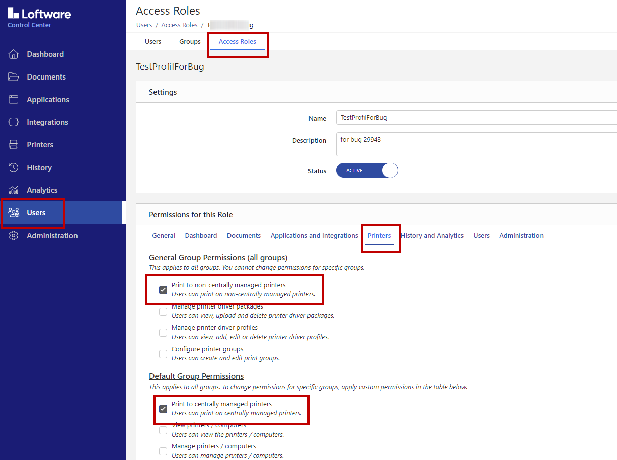 Your custom Access Role Permissions are saved and applied in Control Center and other Loftware programs.