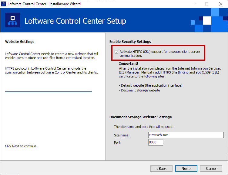 When you are planning to use your Control Center in an open networking environment, select HTTPS support while installing your Control Center for secure client-server communication. If you enable the HTTPS support option during the installation, your Control Center's address becomes https://yourservername/epm (http:// becomes https://).