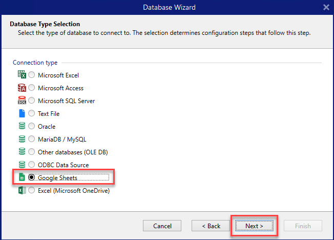 Database Type Selection window opens. SelectGoogle Sheets , then clickNext .