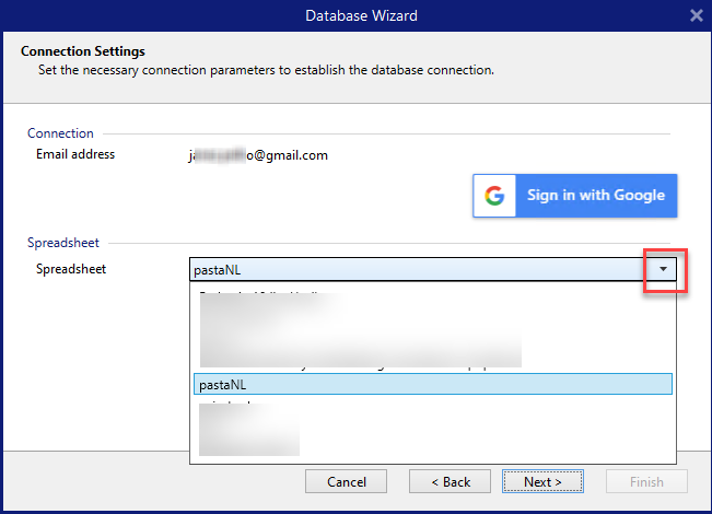 Connection Settings window select your GoogleSpreadsheet , then clickNext .